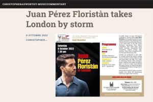 Christopher Axworthy on Juan Pérez Floristán Christopher Axworthy – Music Commentary Wonder of wonders a miracle of ravishing playing where time just stood still as we listened breathless in wonder. A קרא עוד » 11/10/2022
